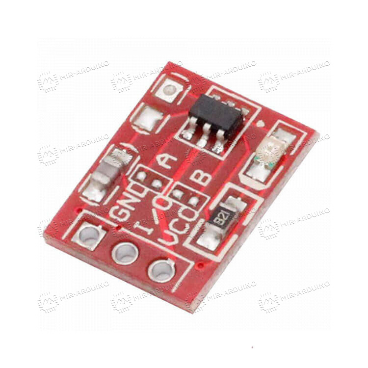Датчик касания TTP223 выполнен в виде сенсорной кнопки на базе контроллера TTP223-BA6. Является бюджетной альтернативой тактовой кнопке. Может работать в режиме фиксации, активируется при прикосновении. Модуль представляет собой плату, которая может подключаться к Ардуино. Пользователь может отрегулировать чувствительность кнопки путем увеличения контактной площадки датчика, уменьшения толщины стенок корпуса, где расположен сенсор, а также с помощью конденсатора меньшей емкости. Предусмотрено три выхода – напряжение питания, земля и выход на микроконтроллер.