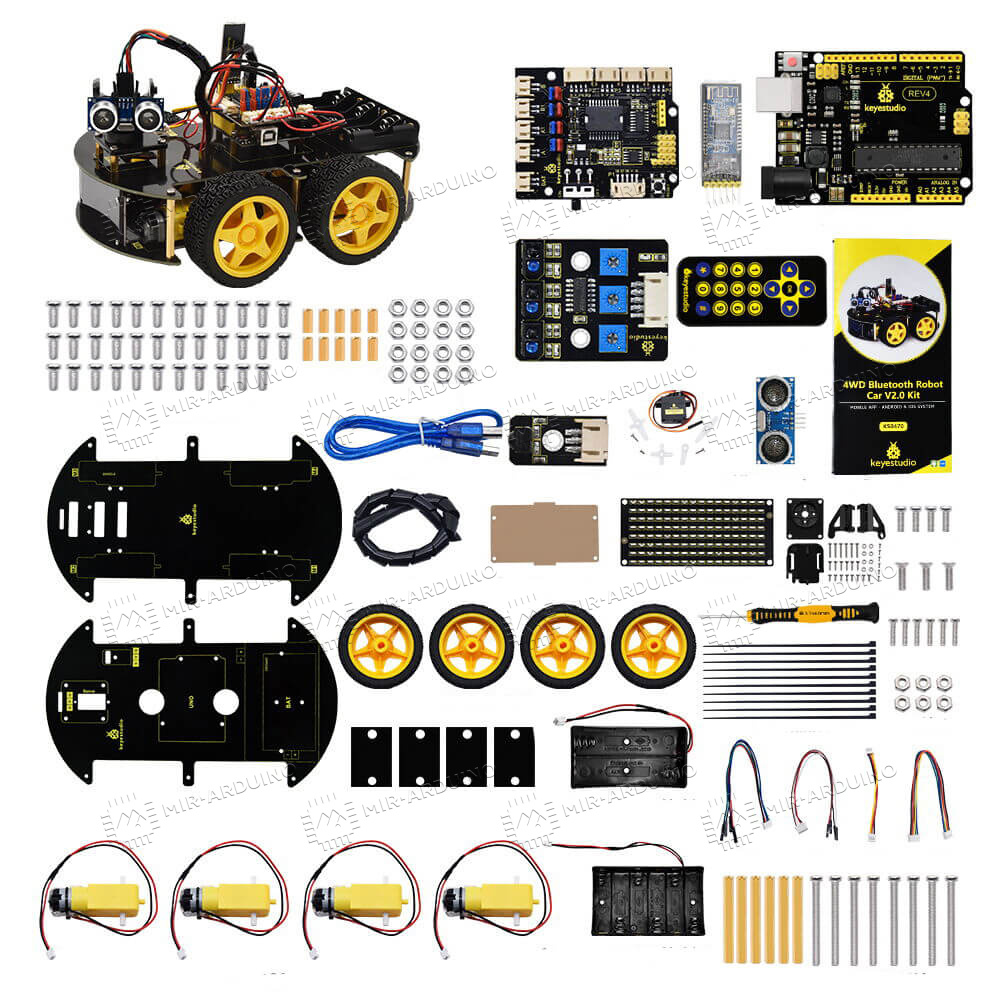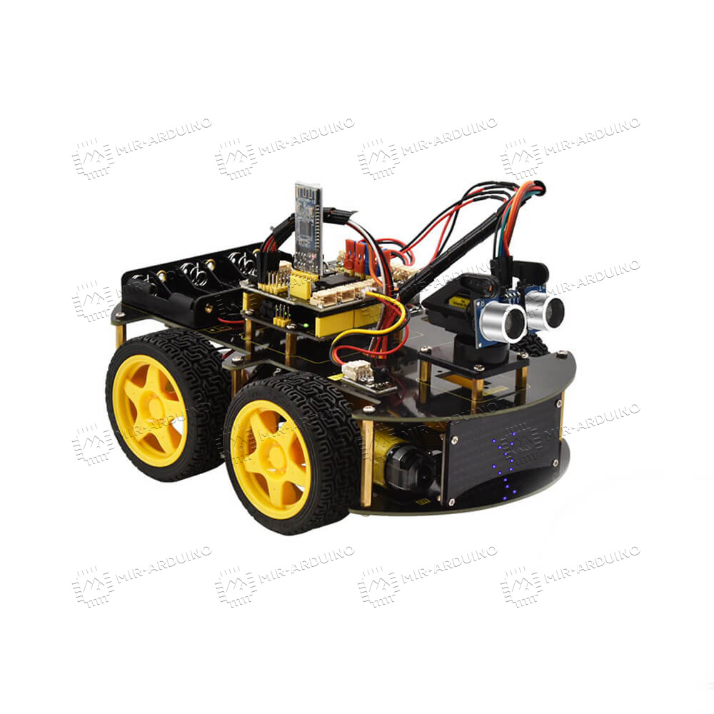 Набор для моделирования Ардуино (Arduino) 4WD BT Car V2.0 позволит спроектировать робот-автомобиль. Умный конструктор подойдет взрослым и детям от 14 лет, которые интересуются электроникой и робототехникой. Набор не требует использования паяльника, поэтому полностью безопасен для ребенка. Созданный робот способен проходить через препятствия, следовать за объектом, передвигаться по заданной траектории. Модернизировать механизм можно путем установки дополнительных датчиков, расширяющих его функционал. Есть возможность дистанционного управления через смартфон, робот синхронизируется с телефоном по Bluetooth.