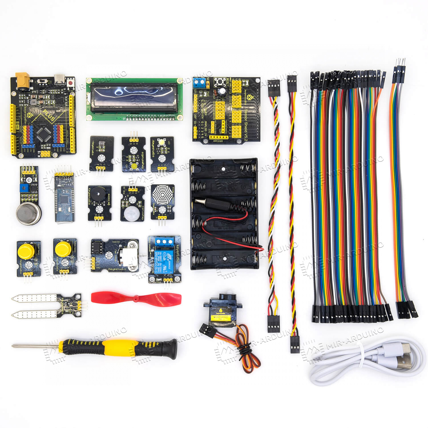 Набор для моделирования Ардуино (Arduino) Smart Home – конструктор для макетирования умного дома в миниатюре. Набор включает в себя корпус будущего домика, а также все необходимые платы, датчики и модули для его автоматизации. На примере конструктора можно понять, как работает освещение, звонок, автоматическое открывание дверей и окон. Управлять всеми системами можно удаленно через свой телефон. Миниатюрный умный дом питается от 6 батареек типа АА, рабочее напряжение составляет 5 В.